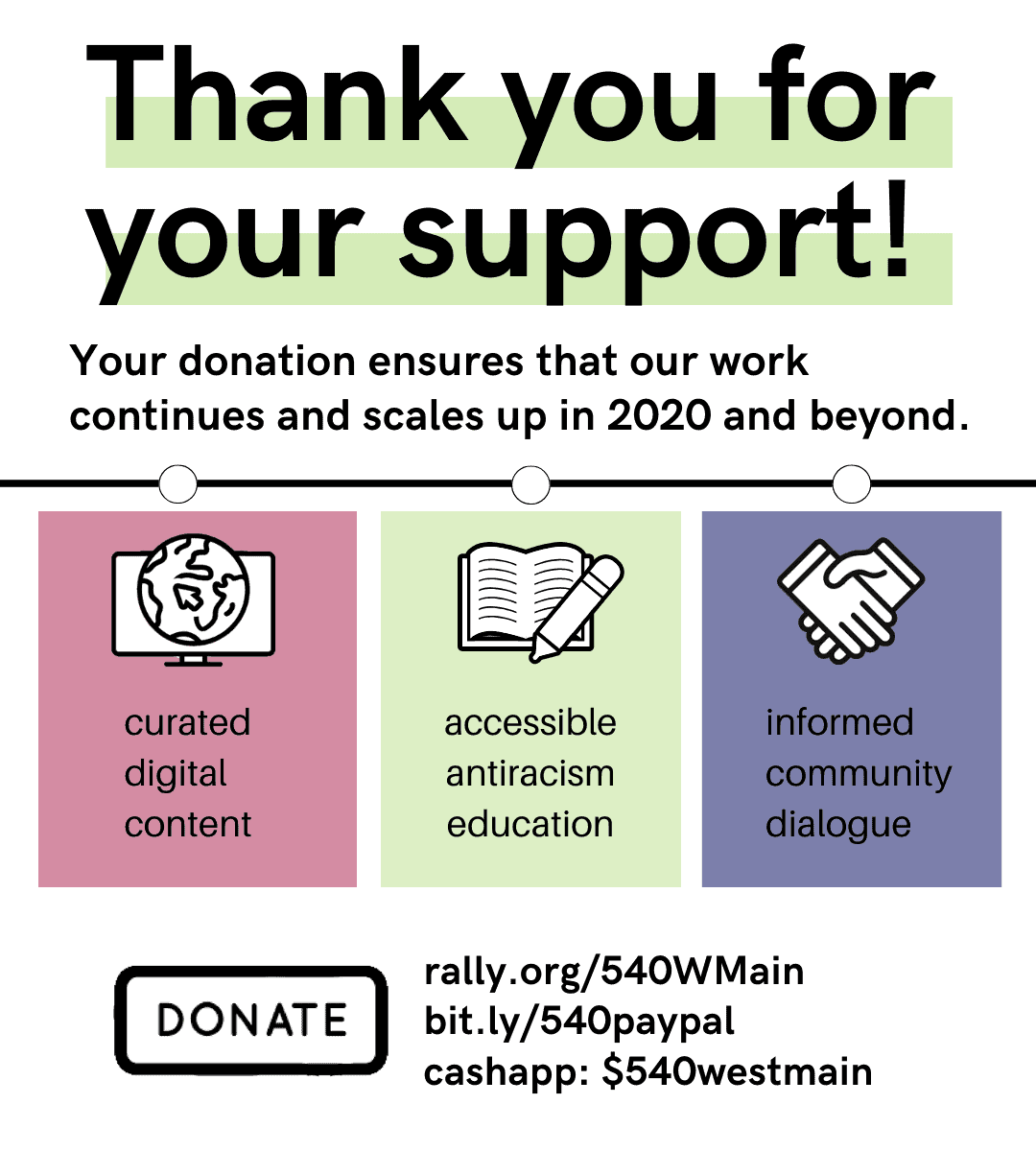 During these uncertain times a 540Monthly Membership ensures that 540WMain is able to create multi-media content, virtual classes, and educational programming rooted in and taught from a social justice and anti-racism perspective. If you love 540WMain consider becoming a 540Monthly member for a little as $3/month.
